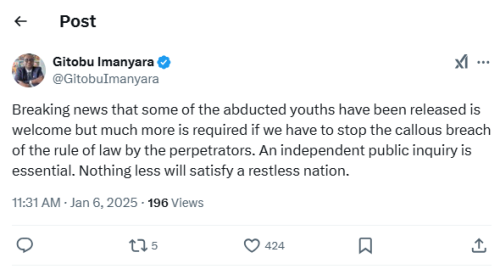 In a post on X on Monday January 6, 2025, following the release of four abductees, Imanyara called for an independent public inquiry, stating that nothing less would satisfy a nation growing increasingly restless over the blatant breach of the rule of law by the perpetrators.